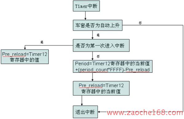 实现的具体做法是:由于只需在车窗自动上升时进行防夹。所以首先先判断是否为自动上升。若是自动上升,则判断是否为第一次进入中断程序,如果是第一次进入中断,将当前计数器中的值存入变量Pre_reload,如果不是第一次进入,则将当前计数器的值减去Pre_reload的值作为周期值,再将当前值存入Pre_reload中。留待下一次进入中断时使用。每进入一次中断就如此工作,直到收到停止命令或车窗到达顶部为止。