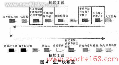 德国BOEHRINGER公司代表梁敏女士讲解了通过曲轴加工线的交钥匙工程实现柔性加工和工艺的替代方法。以四拐曲轴为例,设计生产纲领为15万件/年,生产线布置如图4。典型工序的技术特点如下。