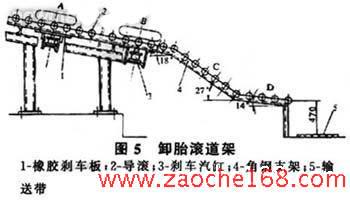 对于硫化子午线轮胎,虽然不需要后充气装置,但也不是只把卸胎滚道架丢到输送带附近。沈阳米其林厂对其有一定要求。要求硫化后的第一锅轮胎要在卸胎滚道架上第一工位上停留一个硫化时间(约12min左右);然后第二锅轮胎硫化出来后,第一锅的轮胎从第一工位到第二工位停留一个硫化时间;当第三锅轮胎硫化出来后,第一锅的轮胎要基本水平从第二工位滑到输送带上。根据这一要求,在实际生产安装过程中,结合现场情况,设计出一较为理想的结构,见图5。