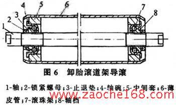 在这里简介一下为沈阳米其林设计制造的卸胎滚道架上导滚的结构。第一批10台,采用的是厚皮管外径加工,内装滚动轴承制造的导滚。由于滚外径加工前有弯曲及管壁厚度不均现象,加工外径后,滚转动起来有偏重及滚动不灵活现象。而且加工成本高、配套轴承费用高、组装后重量也重。后8台改进了设计,参见图6,采用了1.5mm薄皮管,外径不进行加工,轴承采用自行车中轴结构,即轴碗、轴档、滚球架形式的简易轴承,轴采用冷拔钢,中间套点焊在薄皮管上,组装后将管两端用胎具封角。这样做出的滚结构简单,加工量很小,成本大大降低,而且滚动起来非常灵活,没有偏重现象,重量只是原导滚重量的三分之一,该滚结构是卸胎滚道架及其它输送导滚较为理想的选择。