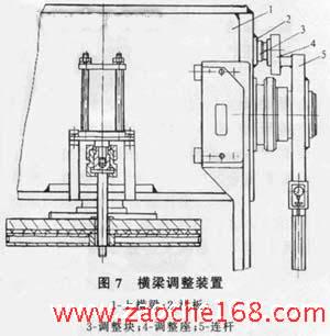 同时建议,为使上横梁到达上极限位时,不左右飘移,在上横梁的两侧焊定位滑板,两联杆上部装调整装置,使上横梁到达上极限时,由两侧联杆上的调整装置定位,左右不至飘移,以保证机械手的装胎精度。调整结构参见图7。
