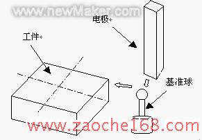利用电极与工件进行直接碰边,因为接触面积较大,电极或工件上的毛刺、存在的细微杂物,电极及工件的平面度、平行度、垂直度等因素影响定位精度,即使工件和电极擦得很干净也难以保证0.01mm的定位精度。对于工件(电极)异形或电极过大(过小)及精度要求相当高的加工来说,有且只有采用间接定位方法,即利用基准球进行间接定位(图2),这种定位方法由于采用的是点接触,可在最大范围内消除误差。