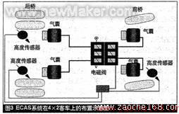 高度调节器负责检测车辆高度的变化,电控单元将接受输入信息,判断当前车辆状态,激发电磁阀工作,几电磁阀实现对各个气囊的充放气调节。 ECAS电控单元、电磁阀、高度传感器、气囊等部件组成。