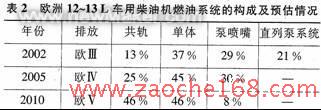 e.燃油系统采用电控共轨系统/电控单.体泵/电控泵喷嘴/HEUI/高压喷射系统。需电控、3~5次的多次喷射(包括预喷、主喷、后喷)能力和更高的燃油喷射压力。如采用共轨系统,额定工况时最大喷射压力要达到180 MPa;如采用电控泵喷嘴或电控单体泵,额定工况时最大喷射压力要达到200 MPa[3〕。为使油耗降低,应缩短喷油持续期,使放热靠近上止点。要借助于喷油规律实现柔和燃烧。表2为欧洲12~13 L车用柴油机燃油系统的构成及预估情况。