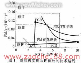 要实现欧Ⅳ对NQx和PM都较低的限值,目前有如图1所示的两条技术路线:其一是先通过喷射系统优化和喷射定时提前以降低颗粒物,再使用SCR来降低因燃烧优化而产生的NQx排放;其二是EGR+DPF路线,即先通过废气再循环降低排放中NOx的成份,再用颗粒捕集器捕集因使用EGR而略有增加的颗粒、物,从而达到同时降低NOx和PM的效果〔6〕。
