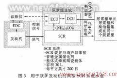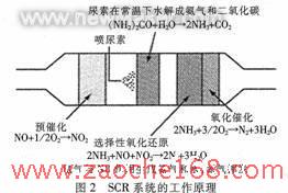 在欧洲,目前采用的一种解决方案是:利用商业用的固体尿素和水(水溶液浓度为32.5%±0.5%),在排气中喷人尿素、氨水等还原性物质,将NQx(主要是NO)还原为N2和H20。如市面上销售的AdBlue,它无毒、洁净、无气味、不易着火、无爆炸危险,但有一点点腐蚀性,必须使用特殊的储存容器。图2为SCR系统的工作原理。