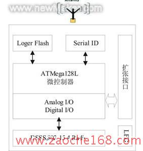 典型的终端节点和汇聚节点设计如图4所示,采用Atmel的8位RISC结构低功耗ATMegal1281VMCU作为系统控制核心。采用512KB的AT45DB041D作为外部程序存储器。射频模块使用Atmel的支持ZigBee协议的AT86RF230,RF功率达到3dBm,室外传输距离可达300米以上节点的扩展接口可连接模拟输入、数字I/O、I2C、SPI和UART接口,这些扩展接口使其易于与传感器及其它外设连接,例如外接光度、温温度、气压、声、地磁和加速度等传感器。