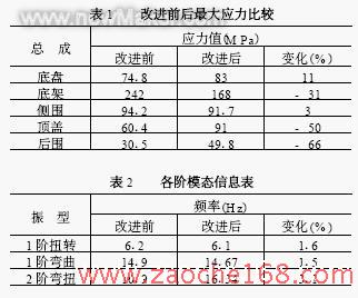 改进前后车身模态特性比较见表2。从上面分析可知,改进后结构的主要振型对应的频率变化较小,且符合设计要求。在标准试验工况中,门框、前后围风窗框对角线长度变化均不超过5 mm ,符合客车设计要求。通过计算得到,整车的质量减小了150 kg。