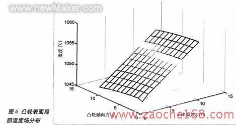 以重熔淬火开始后第处为例。当熔枪从初始位置经过到达凸轮A区某一位置时,我们以凸轮左B区域中,的正方形范围作为研究对象,方向和方向取值间隔均为0.5mm,通过温度场数值模型分别计算该区域内121个点在时的温度值,然后利用MatLab生成凸轮左B区域的局部温度场图6。由局部温度场图可以看出,该区域内的点的x坐标随着沿凸轮周向方向逐步靠近熔枪在第28s时所在的位置,其温度呈现升高明显趋势;同时随着点的Y坐标的变化,其沿轴向的温度变化情况虽然不如周向那么显著,但同样也有不断上升的趋势,即凡是靠近熔枪所在位置的该区.域内的点的温度均高于远离熔枪位置的该区域内的其他点的温度。