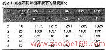 取凸轮左B区点H(x=17,y=6.5)为例,分别计算该点在不同热流密度值(值以3%的比例递增)的影响下,从熔枪运动第los处开始,每间隔los的温度值,结果如表2所示。由表可知,在时间不变的情况下,该点处的温度随热流密度值的增加而增加。而根据热传导理论,热流密度的增大,将使凸轮局部范围内热量增加,熔池深度加深,热影响区扩大。分析表的最后一行,当t=50s时,熔枪早已远离M点所在的左B区,此时该区域内的点的温度均呈现冷却趋势,而在不同热流密度的作用下,冷却幅度不尽相同,热流密度越高,冷却越慢,温度下降范围越小,这也再一次证明了热流量对重熔淬火过程具有重要影响。