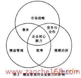 运输企业的精益生产水平、规模经济实现程度和市场营销战略,在很大程度上共同决定着其核心能力。从图2可以看出,企业的精益生产水平与规模经济实现程度两个领域的交集决定了自己的效率水平,精益生产水平与市场营销及战略领域的交集决定了自己的服务水平,而规模经济实现程度与市场营销及战略领域的交集则决定了自己在市场上竞争与合作的程度。也就是说,企业的精益生产水平不但直接决定着铁路企业的效率和服务水平,也是构成企业核心能力的决定性因素之一。