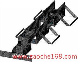 基于此类模型的有限元计算具有建模简便、计算量小的优点,模态计算结果同试验结果比较,具有较好的精度,同时静态强度、刚度计算结果也为车架结构设计提供了理论依据。早期的车架结构计算受CAD 技术和计算规模的限制,多采用梁单元手工建立有限元模型,综述了基于梁杆单元的车架静态计算方法。由于受梁单元本身特点的局限,如无法准确反映纵横梁接头区域的应力分布,且忽略扭转时截面的翘曲变形,随着计算机软硬件技术的发展,目前普遍采用板壳单元建立车架有限元模型,例如较早以板单元为基本单元,同时兼顾规模大小,采用不同尺寸网格对车架结构进行离散。牵引车车架主要结构由Q235A 钢板焊接而成,本文在ProeTM 实体参数化模型的基础上,根据中面位置提取中面模型,在ANSYS 中采用板壳单元shell63 对主要结构进行网格划分,一些起联接作用的槽钢结构,采用了相同截面的梁单元beam188 进行模拟,前桥按照等刚度原则,采用梁单元连接钢板弹簧支撑中节点,车架的板壳梁混合网格模型如图1 所示。