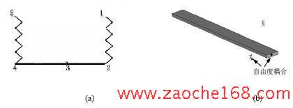 其中K 为钢板弹簧垂直刚度,B 为簧片截面宽度,E 为材料弹性模量;L 为钢板弹簧两吊耳间的水平距离。采用上述方法模拟钢板弹簧,无论从几何外形和力学刚度等效上均较为真实地反映了悬挂对车架结构的影响,将悬架梁单元节点与车架结构节点进行自由度耦合,模拟了悬挂与车架联接的相对运动关系。