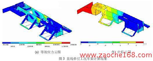直线牵引工况下的车架等效应力分布与变形结果如图3 所示。
