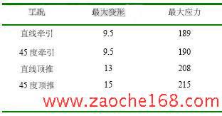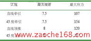 由表1 结果可得,45 度顶推工况下车架的最大等效应力值较其它工况高,其原因在于45 度顶推产生的水平弯矩与垂直弯矩叠加,综合两方向作用力大小与危险点距离,使得该工况为最危险工况,而顶推力的作用点低于车桥支撑点也使得车架前部的垂直位移值较牵引工况有较大增长。