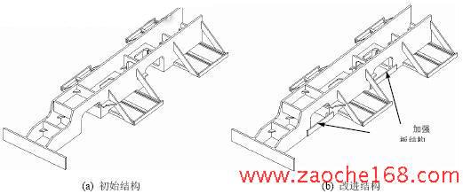 为保证该牵引车具有足够的地面附着力,车架的结构改进以提高其刚强度性能为目标,轻量化目标处于其次的地位[11]。根据结构分析结果,在两∩形孔下部增加局部加强板,初始与改进车架结构对比如示意图4 所示,经过改进后的车架结构分析结果如表2 所示。