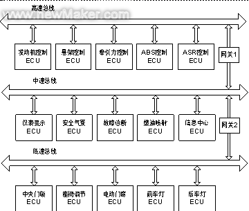 CAN符合ISO/OSI的参考模型,但只规定了物理层和数据链路层的协议,其应用层的协议需要用户自己定义。支持CAN低层协议的芯片有许多,既有在片的MCU,也有片外的CAN控制器。用户自己开发的应用层协议也有很多,如AB公司定义的DEVICENET协议就是CAN协议基础上的应用层协议,Honeywell公司推出的SDS总线也是在CAN的基础上定义了自己的应用层。可见,汽车CAN总线的研究重点是:针对具体的车型开发ECU的硬件和应用层的软件,并构成车内网络。