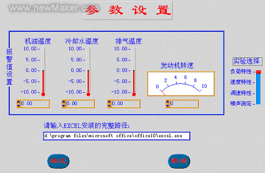 如图 2 所示。由于发动机台架实验一般要做负荷特性、速度特性等好几种实验。在进入测试系统后,可以根据要求选择所要做的实验项目。为了保护实验设备和人员安全,还可以根据不同的发动机设置转速、机油温度、冷却水温度以及排气温度的报警值。只要测得的实验数据超过了所设置的报警值。就自动停机。