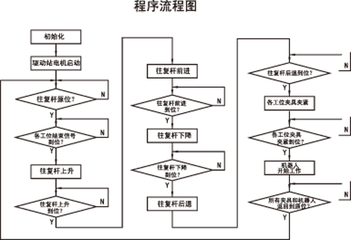 该系统改造选用西门子S7-400系列CPU416-2DP作为控制系统的核心。通过以太网通讯模块CP443-1将主焊线控制系统与车型管理系统相连接,接收车型管理系统传递的车型数据来实现各工位夹具随车型的全自动变换。由于机器人出厂时已配置了Profibus适配卡,因此将26台机器人连接到Profibus现场总线上。其他各工位夹具及现场I/O、SWAC操作面板等均连接到Interbus现场总线系统上,并通过IBS S7 400 DSC/I-T Interbus适配卡与西门子CPU进行数据通讯,整个Interbus现场总线系统上共有86个现场安装的Ruggled Line IP67I/O模块、37个InLine IP20 I/O模块、7个192Bit SWAC操作面板,来实现对所有夹具手动、半自动操作及全自动的操作,以及对往复杆、机器人等设备的控制等。通过人机界面PC870来建立控制系统与外界的联系,实现对设备运行状态的监控及故障信息的显示和存储,以便于更迅速快捷地查找故障,维修设备。至此,整个控制系统的硬件设计就基本完成,根据工艺要求及机械动作时序,设计系统的程序流程如图4所示。