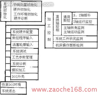 图2中,通用数控模块当具有X轴时使用X、Z轴插补,当不具备X轴时使用Z轴运行监测:直线轴控制是建立在通用数控和主轴转角监测之上的:加工控制中具备机床操作面板和系统工作状况监测:开机后30s如不进行键盘操作则直接进入加工控制:初始化后左边的一系列模块间的关系为平行并列关系,可并行或串行运行:右边一系列模块和加工控制模块间的关系为互斥关系,不能同时运行,它们之间通过键盘进行转换:在不加工环槽或储油槽时,数控程序输入模块被加工参数填表输入模块所替代,以降低对用户技术水平的要求:DOS外壳便于用户运行一些实用的DOS命令:系统诊断为系统的维修和调试而设。