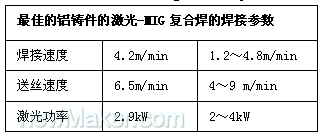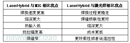 (如表)激光-MIG焊采用激光束和电弧共同工作,焊接速度高,焊接过程稳定,热效率高以及允许更大的焊接装配间隙。激光-MIG复合焊的熔池比MIG焊的要小,热输入低,热影响区小,工件变形小,大大减少了焊后纠正焊接变形的工作。激光-MIG复合焊接,会产生两个独立的熔池,而后面的电弧输入的热量同时起到了焊后回火处理的作用(尤其是在焊接钢时)。
