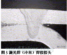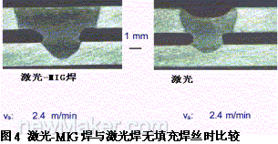 图4描绘了搭接焊时,焊速为2.4m/min,激光-MIG复合焊与激光焊的区别。激光焊时,焊缝表面会产生凹陷,而且熔深很小,焊道窄,抗拉强度低。激光-MIG复合焊时,更多的材料熔入熔池,无表面凹陷产生,节省了熔化焊丝所需的激光能量,这部分能量被用于增加母材的熔深和焊道的宽度,而这恰恰是好的机械性能所必需的。