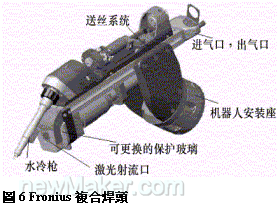 图6所示的是Fronius复合焊头。该焊头几何尺寸小,确保能够有很好的焊接可达性,尤其是在焊接车身时。此外,焊头具有良好的可拆卸性,便于安装到机器人上,以及在焊接过程中焦距和焊炬具有可调功能,调整精度为0.1mm。焊接过程中的飞溅会污染激光头的防护玻璃,为了保护激光系统,在方形玻璃片的两边都喷涂了一层防反射材料。