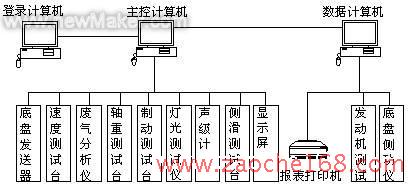 当前国内使用的检测线通常有可以分为两大类,一种是集中式的,一种是分布式的。集中式除登录资料由登录计算机完成外,权限的检测流程、数据采集、处理、判定由主控计算机来完成,显示、打印、存贮等功能由数据机完成。这种方式的优点是结构简单、价格低。分级式一般采用二级分布方式、一级为测控工位控制,各工位分布有工位计算机来完成本工位的控制、数据采集处理和通讯等任务;二级具有排列检测程序,全线调度、汇总综合判定、打印结果和存贮管理数据库等管理。本文主要介绍一下前一种结构的检测线系统。