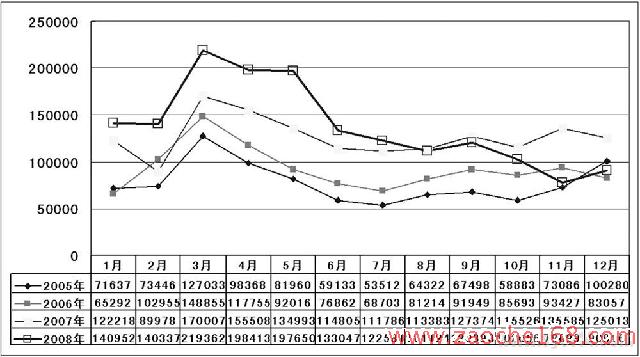 从统计结果看,2008年度我国柴油机市场的产销比是很高的,全年只有3个月的产量大于销量,且库存量很小。这一点与配套整车的情况有很大差别,表明柴油机企业对于市场情况的把握比较准确,也说明在商用车整个行业的产业链条中,柴油机作为核心总成资源的地位非常关键。