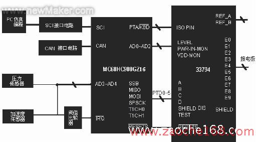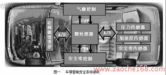 本系统并不直接控制安全气囊与安全带,而是作为CAN总线内的一个节点,向实际控制安全气囊和安全带的微控制器发出部分控制参数。借以实现安全系统的智能化。
