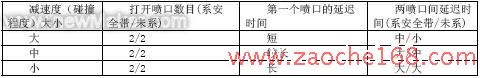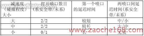 下面列出的是由传感器得到的参数与气囊控制信号之间的关系。具体的值取决于采用的汽车模型与碰撞模型,两喷口开启的延时时间典型值为:12ms,20ms,30ms (50 mile/hour)。