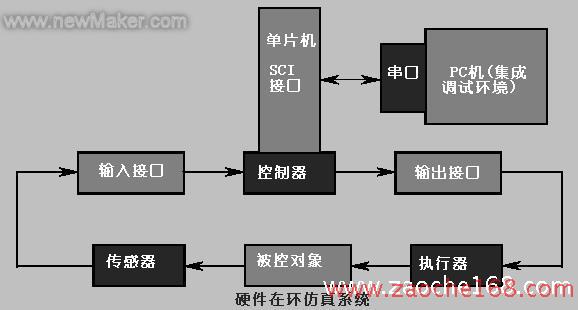 硬件在环仿真是一条有效的调试手段(上图所示)。我们在PC 机上开发了一个单片机集成调试环境,包括友好的人机界面、与单片机的通信模块、控制过程的显示等。同时也要为单片机编写相应的串行口通信和命令服务程序。