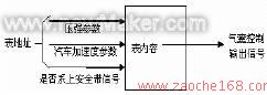 本系统的输出控制信号为气囊的控制信号和安全带预收紧的信号。气囊的控制信号采取查表法来得到。输入信号决定表的地址,表的内容为输出信号。查表时间为一个指令周期。
