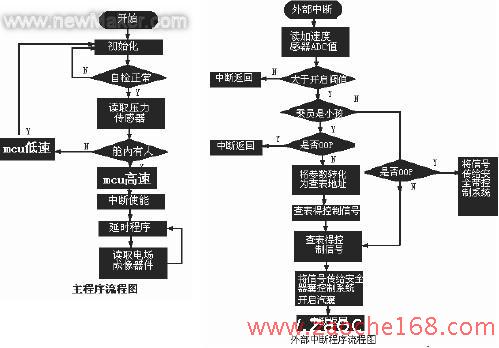 当汽车速度急速下降时,若加速度大于中断阀值(即使得单片机进入中断服务程序的加速度),则向MCU发出外部中断,MCU将加速度传感器得到的模拟量A/D转化后判断该加速度是否超过安全气囊的开启阀值。若已超过,则将各传感器得到的参数转变为查表地址(详细的阐述见第四部分软件描述),进而查表得到气囊参数受传感器参数。