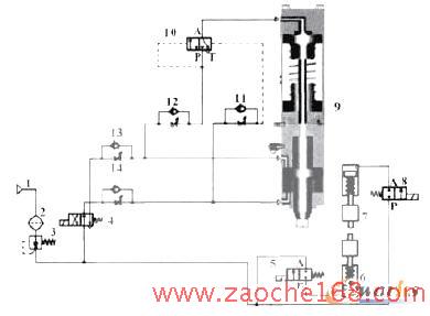 (2)经过一定时间的延时后,电控换向阀4电磁铁通电,压缩空气经调速阀13进入气液增力缸9的工作活塞的上腔,下腔的空气通过调速阀14和电控换向阀4排出,活塞带动冲模快速向下运动。