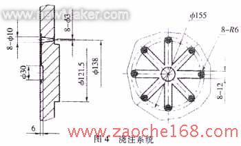 从产品结构简图可看出,该产品外形尺寸较大,需要的胶料较多。为此,浇注系统设计的合理与否对产品的致密性、外观质量有较大的影响。设计的该产品浇注系统的简图如图4所示、该浇注系统设计在盖模板上,流道距离短,8个注胶孔直接注在产品端面上,因此,注胶阻力小,胶料很容易充满型腔。根据经验,该产品注胶孔直径选择在∮2-∮3mm比较合适。注胶孔过小,则进胶速度慢,胶料不能充满型腔。注胶孔过大,则产品在注胶孔处有较大的撕裂痕迹。