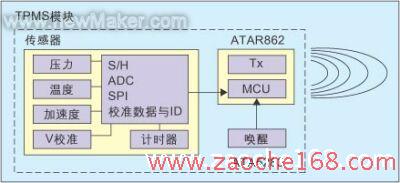 TPMS传感器是一个集成了半导体压力传感器、半导体温度传感器、数字信号处理单元和电源管理器的片上系统模块。为了强化胎压检测功能,有不少TPMS传感器模块内还增加了加速度传感器、电压检测、内部时钟、看门狗,和带12位ADC、4kB Flash、2kB ROM、128B RAM、128BEEPROM及其它功能的ASIC数字信号处理单元。这些功能芯片使得TPMS传感器不仅能实时检测汽车开动中的轮胎压力和胎内温度的变化,而且还能实现汽车移动即时开机、自动唤醒、节省电能等功能。电源管理器确保系统实现低功耗,使一节锂电池可以使用3-5年。