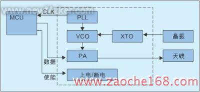 MCU一般为4位或8位CPU核,包括时钟管理、EEPROM、RAM、多个计时器、多个I/O口、内部晶振等。UHF RF发送器以ATAR862为例,其内部嵌入的是T5754 UHF ASK/FSKRF发送器,T5754内部由PLL、VCO、功率放大器等组成(见图3),外部晶振源经串口谐振器供给VCO,PLL向MCU提供时钟,MCU将已编码的数据流经功率放大器调制在UHF指定频率,交由天线发射。天线采用印制在PCB板上的环状天线,发射功率要求PA在9.5mA时能输出7-10dBm。