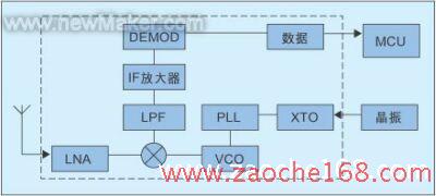 TPMS接收器由UHF ASK/FSK RF接收IC和信号处理MCU、键盘、LCD显示器组成。RF接收IC和信号处理MCU安装在一个盒子里,可安装在汽车仪表箱内,带控制键盘的LCD显示器可安装在驾驶台上,LCD显示器能实时显示每个轮胎的压力、温度和每一个轮胎的ID识别码,以及声光报警。 UHF ASK/FSK RF接收器以T5743为例,该芯片由低噪音放大器(LAN)、低通滤波器(LPF)、中频功率放大器、ASK/FSK解调器、数据接口,以及PLL、XTO、VCO、混频器组成(图4)。天线接收到的信号经RF模拟前端的LAN放大、LPF滤波、ASK/FSK解调,取出的数据流交TPMS接收器的MCU,经软件处理还原出胎压、温度、ID码给LCD显示,并智能辨别系统是否安全,以及提供声光报警。