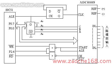 由于本系统需处理多路模拟信号,故采用ADC0809 A/D转换模块,它采用逐次逼近的方法完成A/D转换;其片内带有锁存功能的8 路模拟开关,可对8路0~5V的输入模拟电压信号进行转换, 完成一次转换约需100μs。其输出具有TTL三态锁存缓冲器,可直接接到单片机89C51的P0口。 ADC0809 与89C51接口电路如图4所示。
