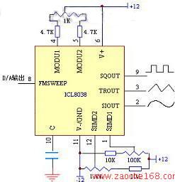 ICL8038是美国Intersil公司生产的单片精密函数发生器专用芯片,可以输出0.00l Hz一300KHz高质量的正弦波、矩形被(或方波、窄脉冲)、三角波(或锯齿波)等函数波形,具有频率范围宽、频率稳定度高、外围电路简单、便于制作等优点。