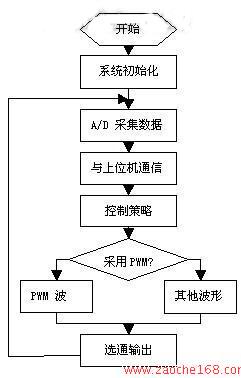 控制系统软件设计流程图如图5所示,初始化主要是配置MC68HC908GP32的CONFIG寄存器和PLL控制寄存器,并初始化输出波形。接着启动GP32内部A/D转换器,采集压力和位移信号,与上位机通信进行数据处理和显示,根据控制策略选择合适的控制波形。这里给出主程序主体框架 (限于篇幅,程序框架大部分为子程序形式) :
