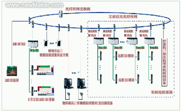 在ControlLogix控制系统中配置了1756-ENBT以太网通讯模块,通过工业以太网(环网光纤)将各机运线的多个PLC和现场使用的各种设备(拧紧机、加注机等单机联网设备,均含有以太网接口)连接到一起,实现不同PLC之间的互相通信,完成整个系统的控制、故障报警、信息交换等功能,也能方便在以后增加设备或给新的生产信息系统提供设备的实时数据。