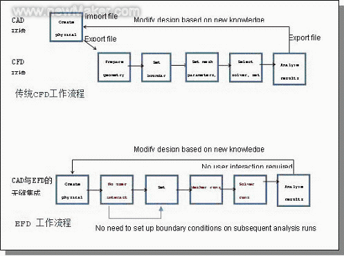 区分EFD的一重要方面在于它无缝集成于工程师所熟悉的机械CAD软件包。安装EFD软件后,所有需运行流动或热分析的菜单和命令都集成于CAD软件包。EFD将CAD和CFD两者的功能紧密结合(见图1),其拥有的几大主要优势在于: