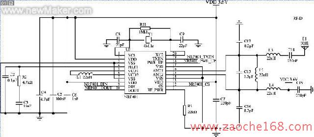 NRF401的ANT1和ANT2是天线的输入/输出复用脚。在输入模式时,射频信号通过将该脚连接到低噪音放大器后解调;同样,在输出模式时,调制的信号在功率放大后,通过该脚输出。