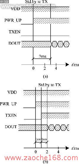 7脚和8脚分别为数据输入脚和输出脚。配合18脚PWR_UP和19脚TXEN上的电位时序完成信息的发送和接收。图3是进行数据发射和接收时控制各引脚操作时序图。
