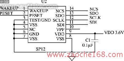SP12是英飞凌公司的轮胎压力传感器IC,如图4所示,通过MEMS技术集成了压力和温度、加速度、电压的检测电路,直接以数字形式输出各物理量的示值,与外围采用SPI协议进行交互。