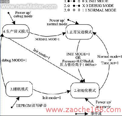 软件总体分为4个运行模式:调试模式(工厂诊断用)、初始化模式、睡眠模式(休眠)和测量模式。