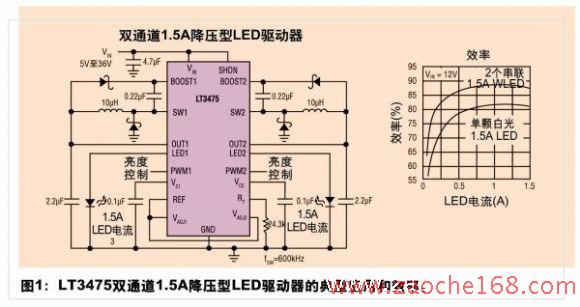 LT3475是一款双通道、36V、2MHz降压型DC/DC转换器,专为用作恒定电流双LED驱动器而设计(见图1)。每个通道具有一个内部检测电阻器和调光控制功能,从而使其非常适合于驱动那些需要高达1.5A电流的LED。一个通道的开关操作与另一个通道异相180°,因而使得两个通道的输出纹波均有所减小。每个通道均独立地在一个50mA至1.5A的宽电流范围内保持了很高的输出电流准确度,而独特的True Color PWMTM 电路提供了一个3000:1的调光范围,且未发生任何的色偏移(这种现象在LED电流调光中很常见)。