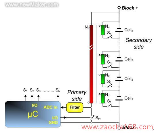 下文中描述的方法只需增加很少量的额外硬件就能测量所有电池单元的电压。在该方法中,主要任务是进行充电平衡的变压器同时也被用做一个复用器。